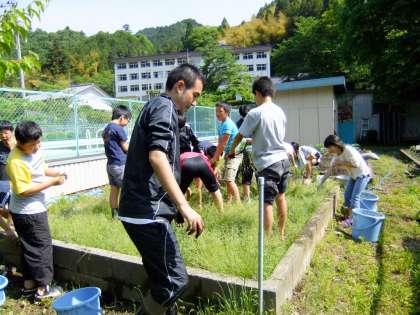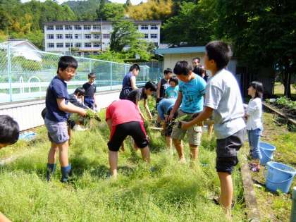 5月25日(水)に、5〜6年生が合同で田植えの準備をしました。草取りをした後、田んぼの土を掘り返し、水を入れて「しろかき」をしました。いよいよ来週は「田植え」をします。