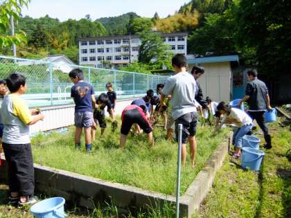 5月25日(水)に、5〜6年生が合同で田植えの準備をしました。草取りをした後、田んぼの土を掘り返し、水を入れて「しろかき」をしました。いよいよ来週は「田植え」をします。