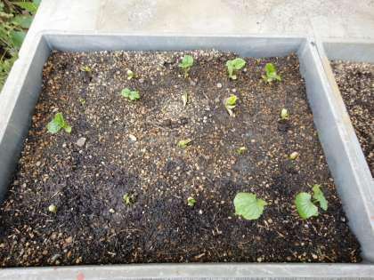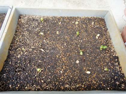 給食室の皆さんが昨年からとっておいた「ゴーヤの種」を蒔いて、苗を作っていました。元気に発芽してきていました。