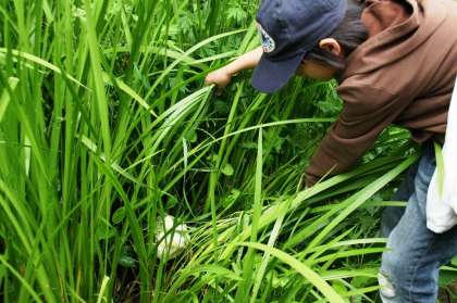 5校時に、3〜4年生がプールとビオトープで「モリアオガエル」の卵採りをしていました。全部で3個の卵を採りました。でも、まだ3個残っています。