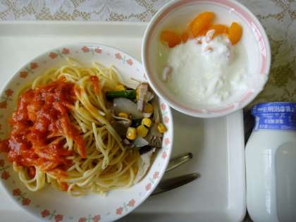 8日(水)の給食は「スパゲッティーペペロンチーノ」「鶏肉のトマトソース」「アスパラとエリンギのソテー」「ヨーグルトのミカンあえ」「牛乳」でした。