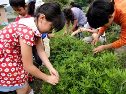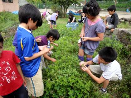 9日(木)は「ヨモギ摘み集会」がありました。全校児童で冬の「餅つき会」の時に使う「ヨモギ」の新芽を摘みました。