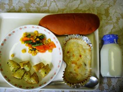 10日(金)の給食は「ミルクパン」「和風豆腐グラタン」「じゃがころ揚げ」「インゲンとコーンのソテー」「牛乳」でした。