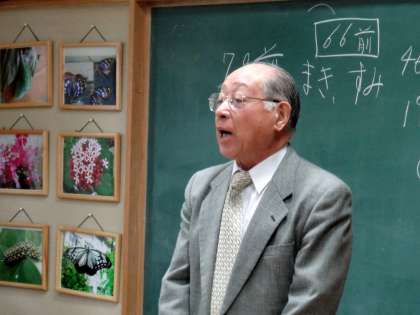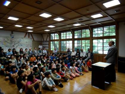 10日(金)は恩二小の138回目の「開校記念日」でした。朝、開校記念集会を行いましたが、これには恩二小の卒業生でもあるブルーベリー農家の中村貞夫さんに来ていただき、お話をしていただきました。