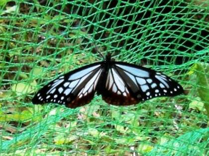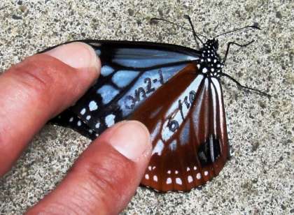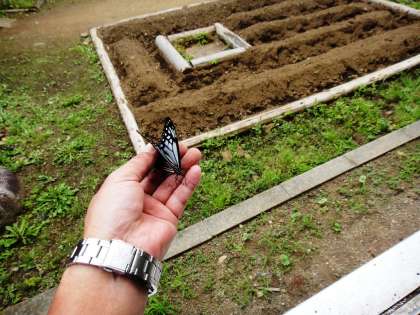 保護者の方達と話している時、偶然にも羽化したばかりの「アサギマダラ」を見つけ、マーキングをして1年教室から放蝶しました。「on2・1 6/10」マーキングしました。