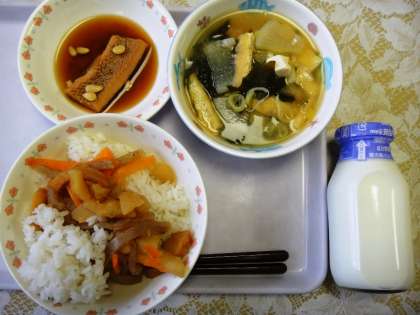 14日(火)の給食は「麦ご飯」「イカの松かさ煮」「ジャガイモのキンピラ」「みそ汁」「牛乳」でした。