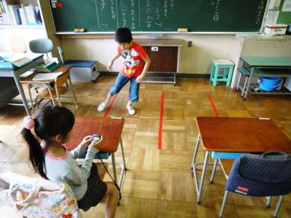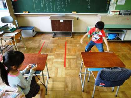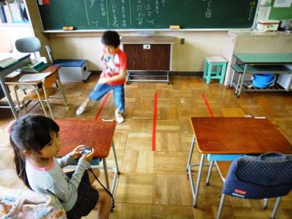 放課後に2年教室で、スポーツテストの練習をしている子がいました。「反復横跳び」もだんだんと上手になってきていました。