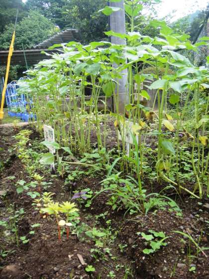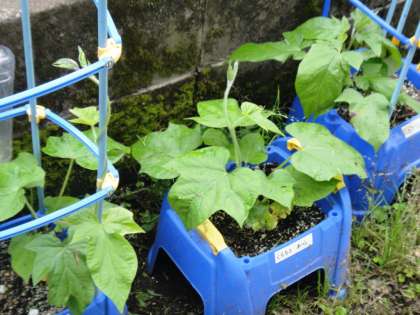 放課後に畑の整備をしました。「レイシ」の網をかけ、「ヘチマ」の網もかけました。アサガオも大きく成長していました。