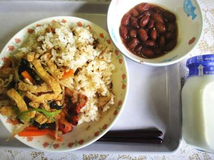 21日、今日の給食は、「ゴマジャコご飯」「鶏肉の七味焼き」「煮浸し」「金時豆」「牛乳」でした。