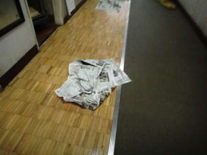 21日、朝から1階の廊下と階段の結露がすごかったです。このシーズン、3〜4回の結露がありました。廊下が滑るので、新聞紙を敷きました。