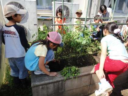 2年生が畑の手入れをしていました。ミニトマトは大きく成長していました。キュウリはヒモで支柱に結んでいました。