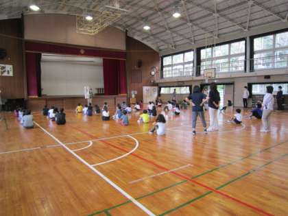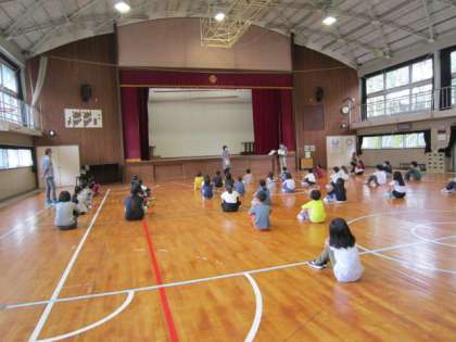 朝会で図書の担当の先生や司書の先生からお話を聞きました。このあと昼休みには、パネルシアターが行われます。