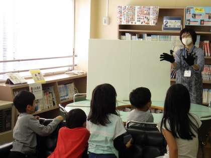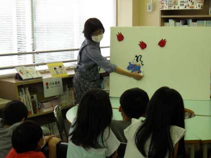 司書の先生が、昼休みに軍手人形『カラスの赤ちゃん』、パネルシアター『おばけおばけのかぞえうた』を上演してくれました。みんな食い入るように見ていました。