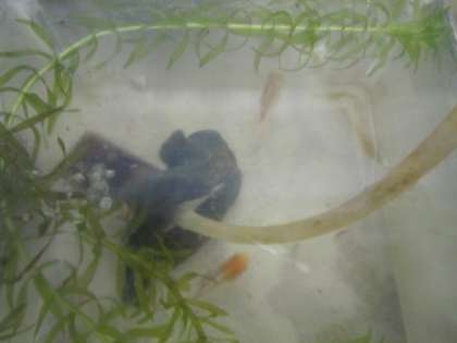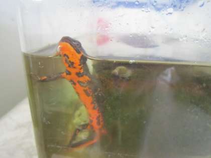 アカハライモリは、いつも通り元気です。金魚の赤ちゃんもすくすく育って赤ちゃんではなく子どもになりました。小学生くらいでしょうか。