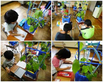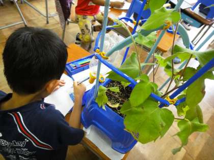 1年生がアサガオの観察をしていました。
