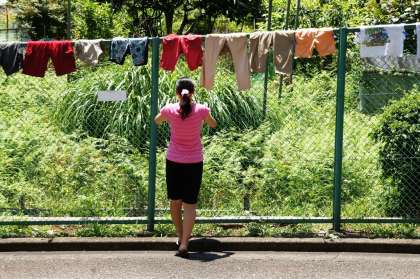 3校時、玄関前のフェンスにはたくさんの乾かしものが干してありました。