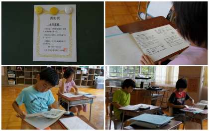 終業式の後、4年教室に行ってみました。夏休みのしおりを読んでいました。