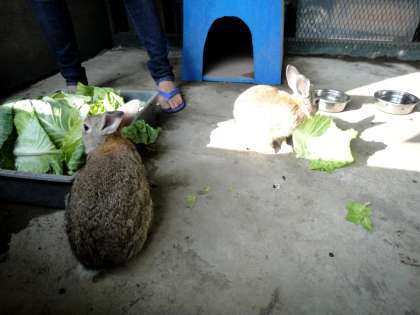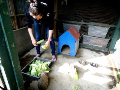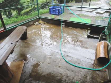 夏休み第一日目。日直の先生が「うさぎ・やぎ当番」をやってくれました。台風のための雨と風の中、傘をさしてエサやり等をしてくれました。