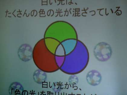 この「わくわく科学教室」では、「デジカメぬりえ」「内視鏡って何?」「カメラオブスキュラ」「光イリュージョン」「宝石をさがそう」「シャボン玉」「万華鏡を作ろう」「立体映像・虹」「色の不思議」の10コーナーが開設されました。