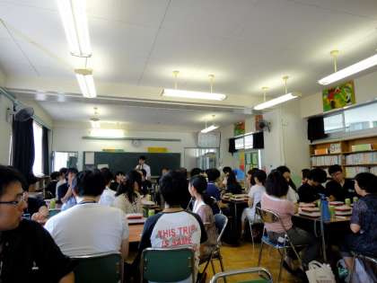 昼食はオリンバスのスタッフの皆さんや、PTAの皆さん達が図書室に集まり、反省会もかねて行なわれました。(総勢80名にもなりました。)