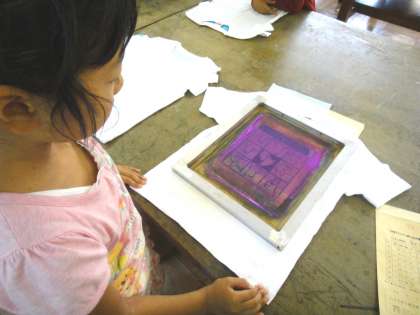15日、夏休みにTシャツ作りができなかった子ども達のプリント作業を中休みにしました。