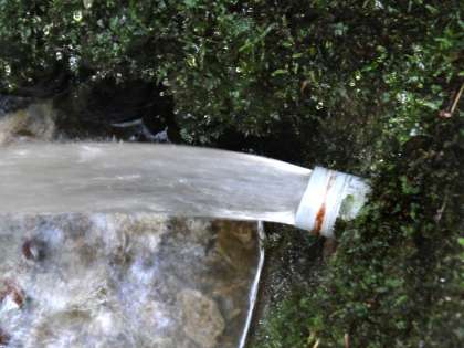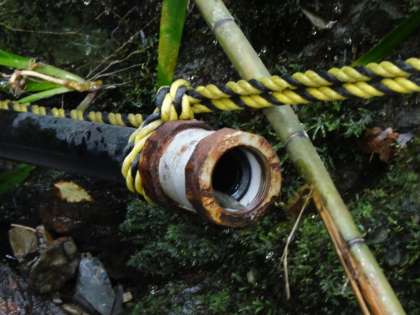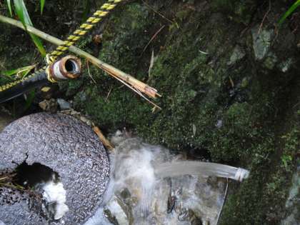 取水口まで山を登って行きましたが、何と、配水管が外れていました。水の流れる勢いなのか、樹木が流れてきてぶつかったか…。