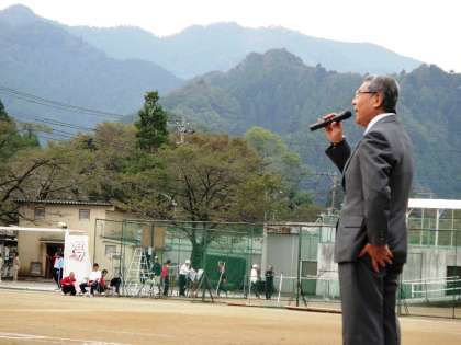 恩方地域の30町会のテントが張られる中、入場行進が始まりました。そして、開会式が行われ、今泉大会会長から挨拶がありました。ちょっと遅れて来場した、黒須八王子市長からも挨拶がありました。
