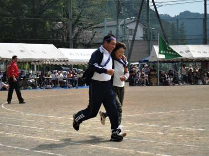 プログラム8番は「二人三脚」。恩二小の子や保護者の方達、副校長先生も参加しました。