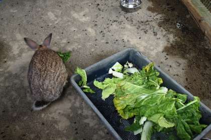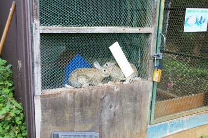 13日(木)、ウサギの「チョコ・シロ」とヤギの「二郎」に朝のエサやりをしました。キャベツなどをよく食べていました。
