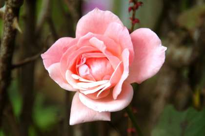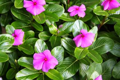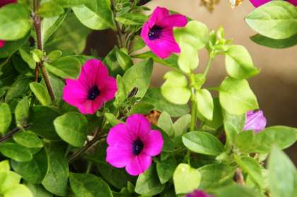 玄関の草花が満開です。「日々草」「バラ」「サフィニア」です。