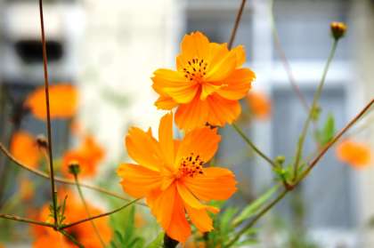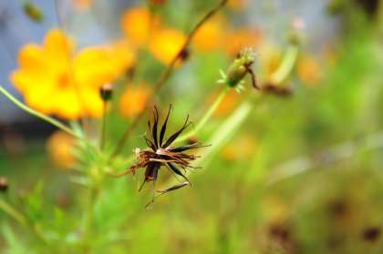 キバナコスモスがきれいに咲いて、恩二小の草花も活気づいてきました。