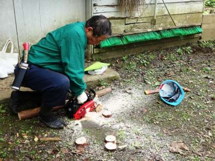 間伐体験が終わり、校庭に戻ってきました。終わりの会の後、コースター用の杉の木をいただきました。