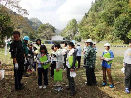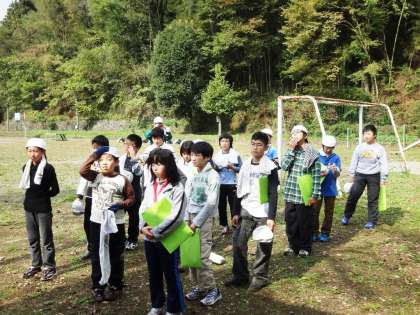 間伐体験が終わり、校庭に戻ってきました。終わりの会の後、コースター用の杉の木をいただきました。
