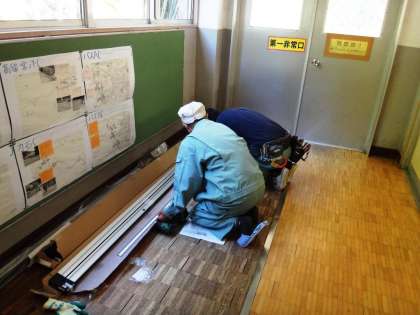25日(火)も網戸の工事のために、業者の方が来校しました。1年教室前の体育館へ行くドアにも網戸をつけてくれました。