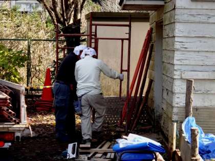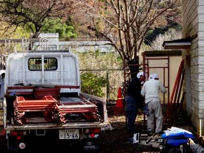5日(月)から、体育倉庫の修理のために業者の方達が作業を開始しました。屋根と側面の板を張り替える予定です。