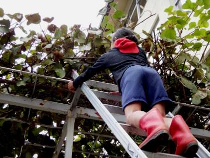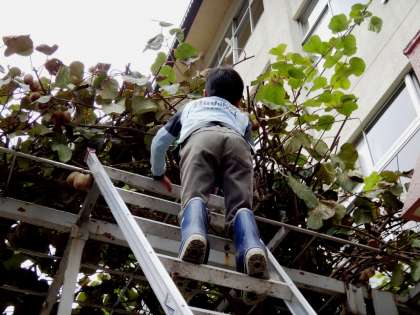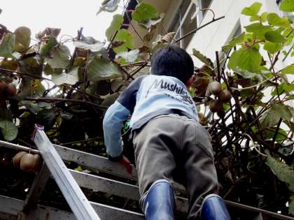 6日(火)の飼育栽培委員会の時間に、キウィーフルーツの収穫をしました。約40個の果実を収穫したので、近いうちに給食に出ると思います。