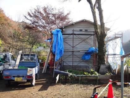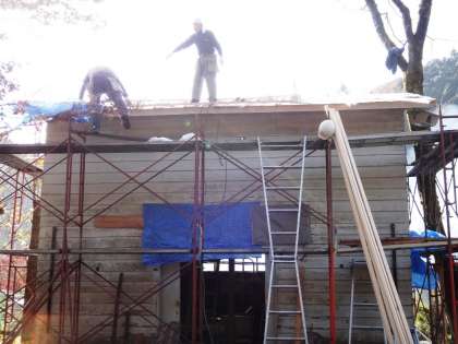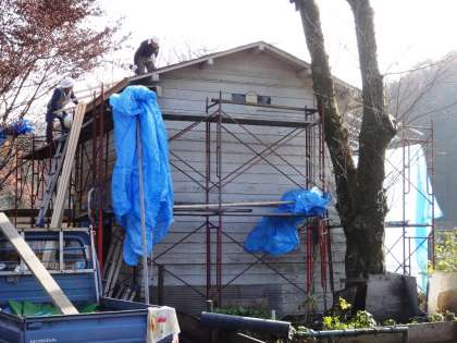 体育倉庫の工事が朝からありました。足場を組んだ後、今日は屋根の工事をしてくれました。