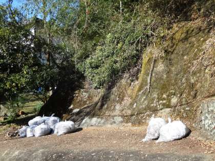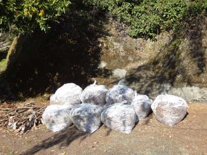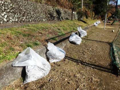 用務主事さんが、校庭の落ち葉をたくさん集めてくれています。今までに200袋もの落ち葉を集め、廃棄してくれましたが、追加でまたたくさんの落ち葉を集めてくれています。