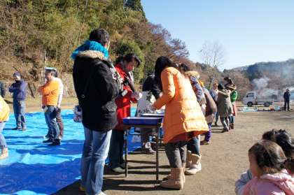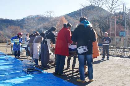早朝よりPTAや地域の方達が「もちつき会」の準備をしてくださいました。子ども達が校庭に来る前に、何臼かおもちをつきました。そして、「まぶし」も始まりました。
