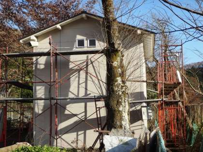 体育倉庫の工事が進んでいます。今日は、外壁も取り付けられました。