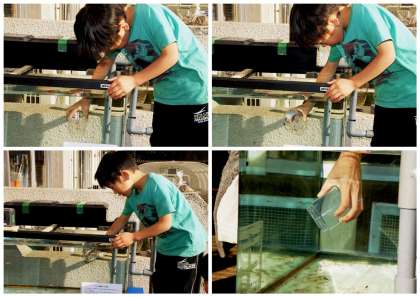 子ども達がヤマメの稚魚を水槽に移しました。