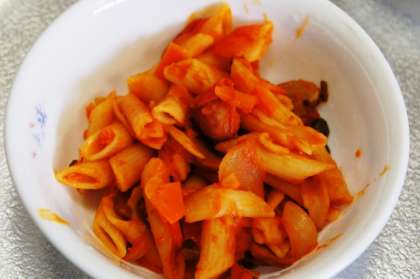 マカロニの方は、マッシュルームを入れてありました。他にタマネギ、ニンジン、ピーマンも入っていました。丁度よくマカロニが茹でてあり、おいしかったです。