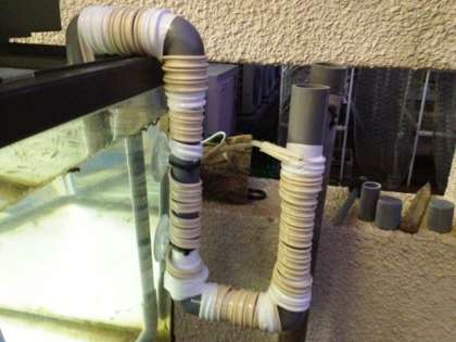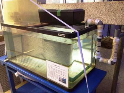 昼休み、ヤマメの水槽の配水管(サイホン)を取り外して、パイプの接続箇所に接着剤を塗り、ビニルテープで完全に隙間をふさぎました。