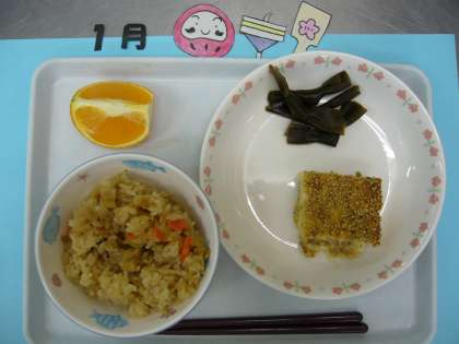 「松風焼き」「結び昆布の煮物」「果物」「牛乳」でした。
