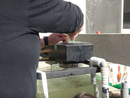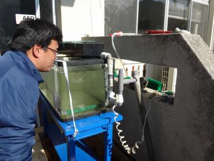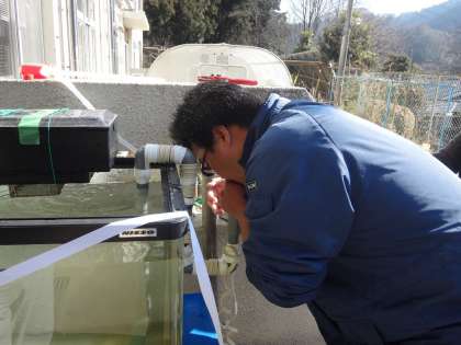 1月17日(火)、11時頃に出張から帰ると奥多摩魚養殖センターの方達が来校してくださり、ヤマメの水槽の修理をしてくれていました。