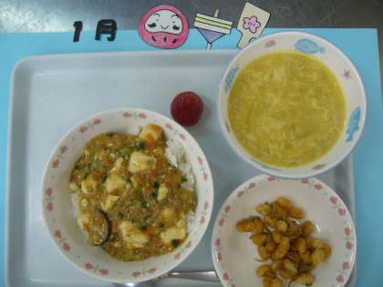 「マーボーなす丼」「玉子とコーンのスープ」「豆じゃこ」「果物」「牛乳」でした。