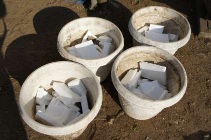 培養土が少ないので、発泡スチロールを入れて「あげ底」にしました。