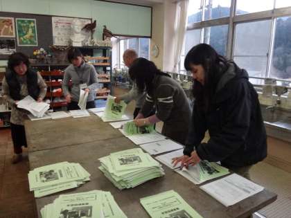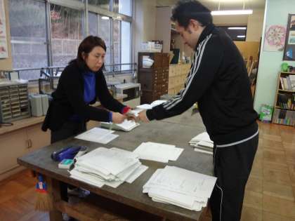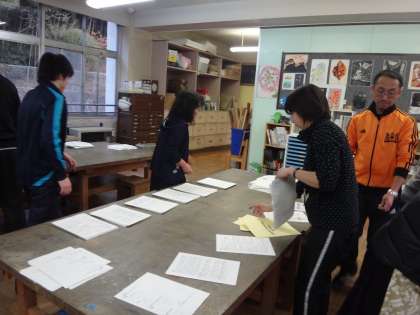 放課後、プレゼンテーションの最終確認をした後、図工室で指導案集の綴じ込みをしました。全部で250部もの綴じ込みをしました。