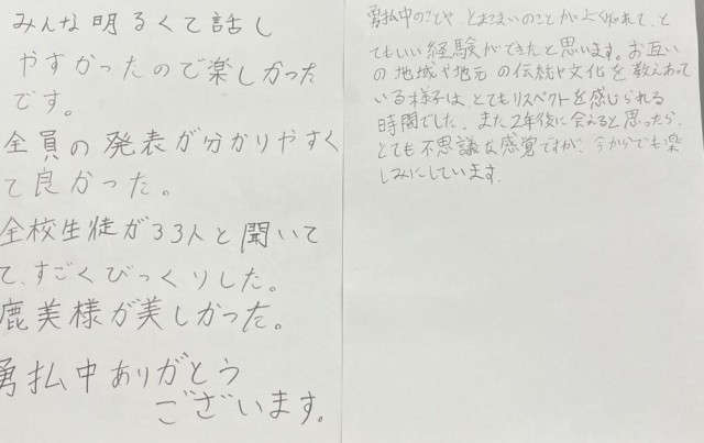 勇払中学校と恩方中学校1年生の交流授業の感想です。お互いの交流によってそれぞれの地域の違いや、2年後の直接交流に向けての期待が伝わってきます。