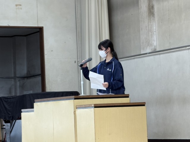 前期生徒会役員の仕切りでは最後となる生徒会朝礼で今週はスタートです。生徒会目安箱の質問報告や各種委員会の報告を行い、今週から約3週間の教育実習を行う芳賀千咲さんの紹介がありました。教科は体育、1年1組の所属となります。